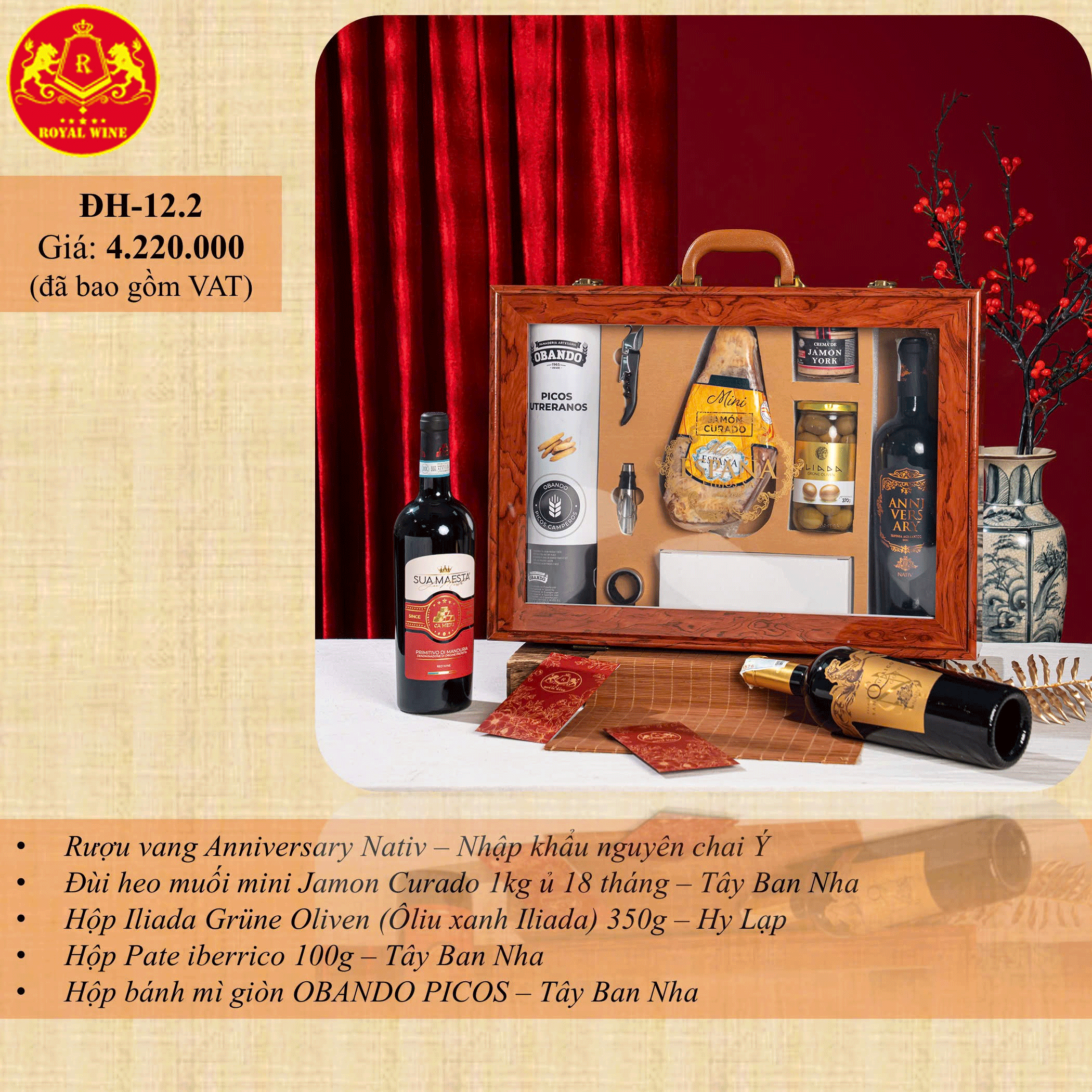 Hộp quà được tuyển chọn kỹ lưỡng từ các thương hiệu uy tín của Ý, Tây Ban Nha và Hy Lạp, mang đến trải nghiệm thưởng thức trọn vẹn từ rượu vang, thịt nguội cho đến các món ăn kèm truyền thống. Cùng Vangchat tìm hiểu ngay sau đây về các thành phần bên trong hộp quà ĐH12.2