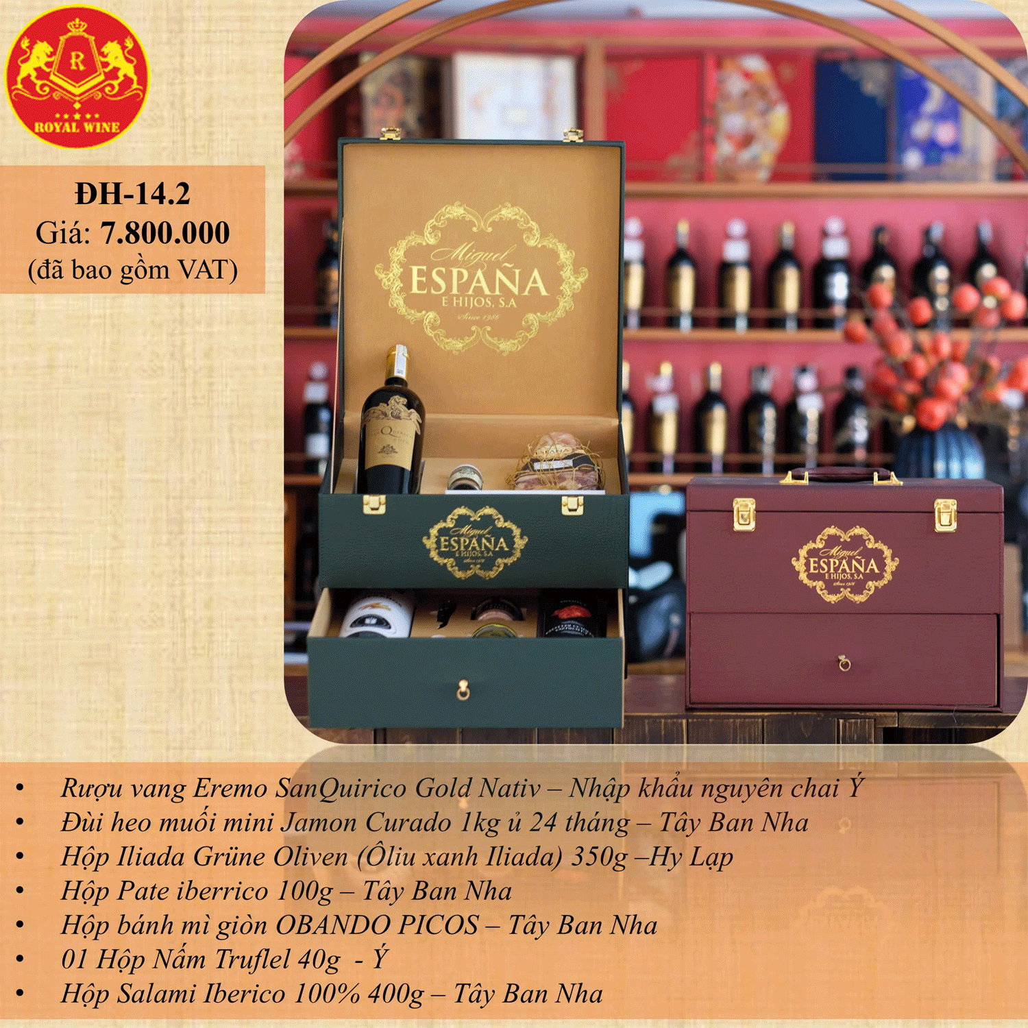 Hộp Quà Tết Eremo San Quirico Gold là sự tuyển chọn khắt khe giữa vang Ý sang trọng và các đặc sản Iberico thượng hạng, tạo nên món quà Tết khác biệt, vừa giá trị thưởng thức, vừa thể hiện trọn vẹn thành ý và phong cách của người biếu tặng trong dịp Xuân về.