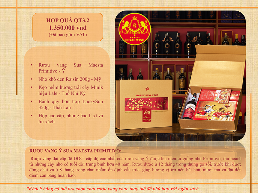Hộp quà Tết rượu vang 2026 QT03.2 là sự kết hợp hoàn hảo giữa thiết kế tinh tế và ý nghĩa sâu sắc. Hộp được làm từ giấy mỹ thuật cao cấp, kèm theo túi xách sang trọng. Chai rượu vang Sua Maesta Primitivo đến từ Ý, là điểm nhấn hoàn hảo cho hộp quà, thể hiện sự tinh tế và sự trân trọng trong dịp Tết. Đây là món quà lý tưởng để bạn gửi gắm tình cảm và gìn giữ những giá trị văn hóa truyền thống trong dịp năm mới.