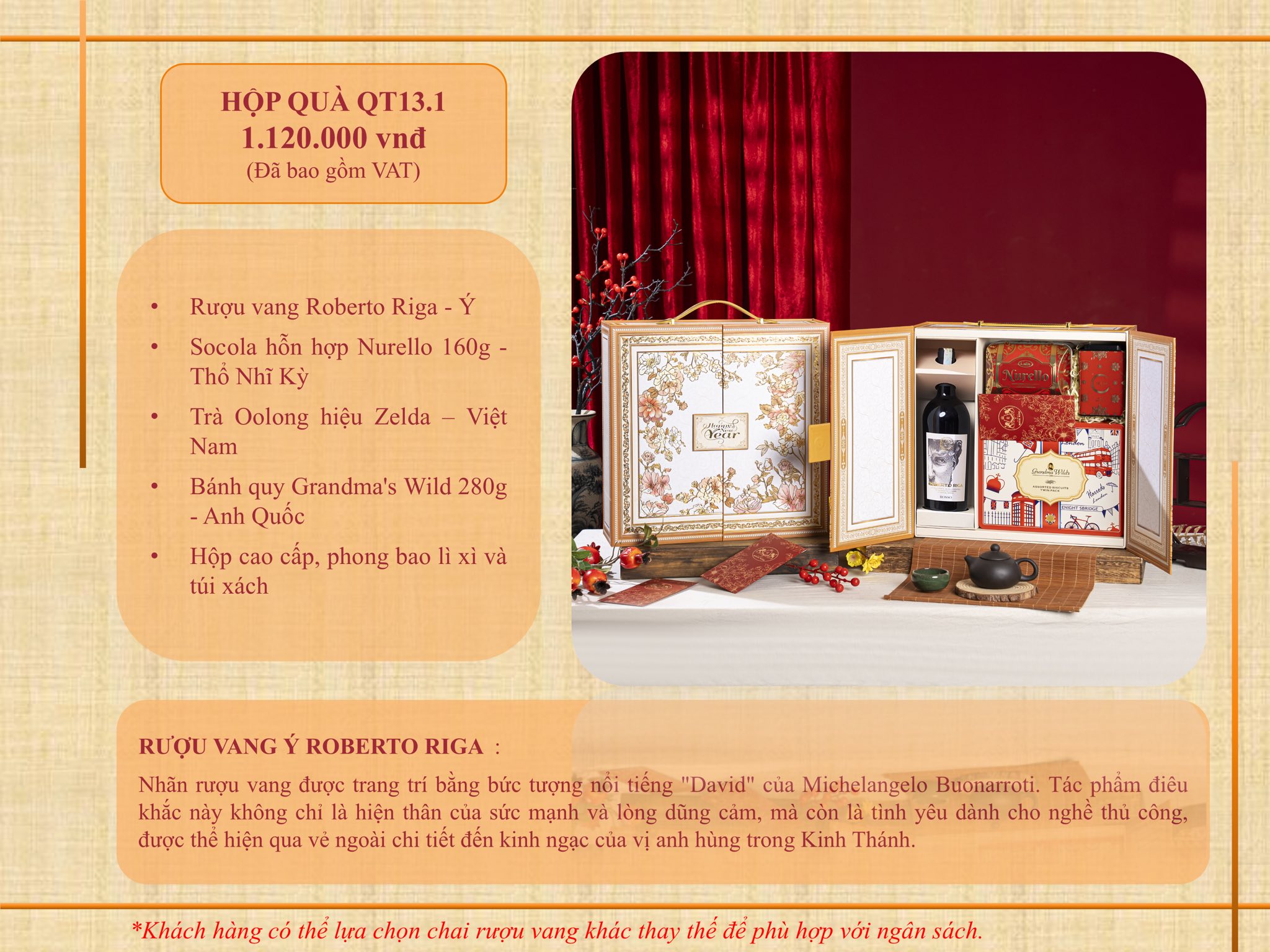 Hộp quà tặng QT13.1 lựa chọn hoàn hảo, với sự kết hợp tinh tế của rượu vang cao cấp và những món quà đặc sản, mang đến một trải nghiệm đầy đủ hương vị, sang trọng và đẳng cấp cho người nhận.