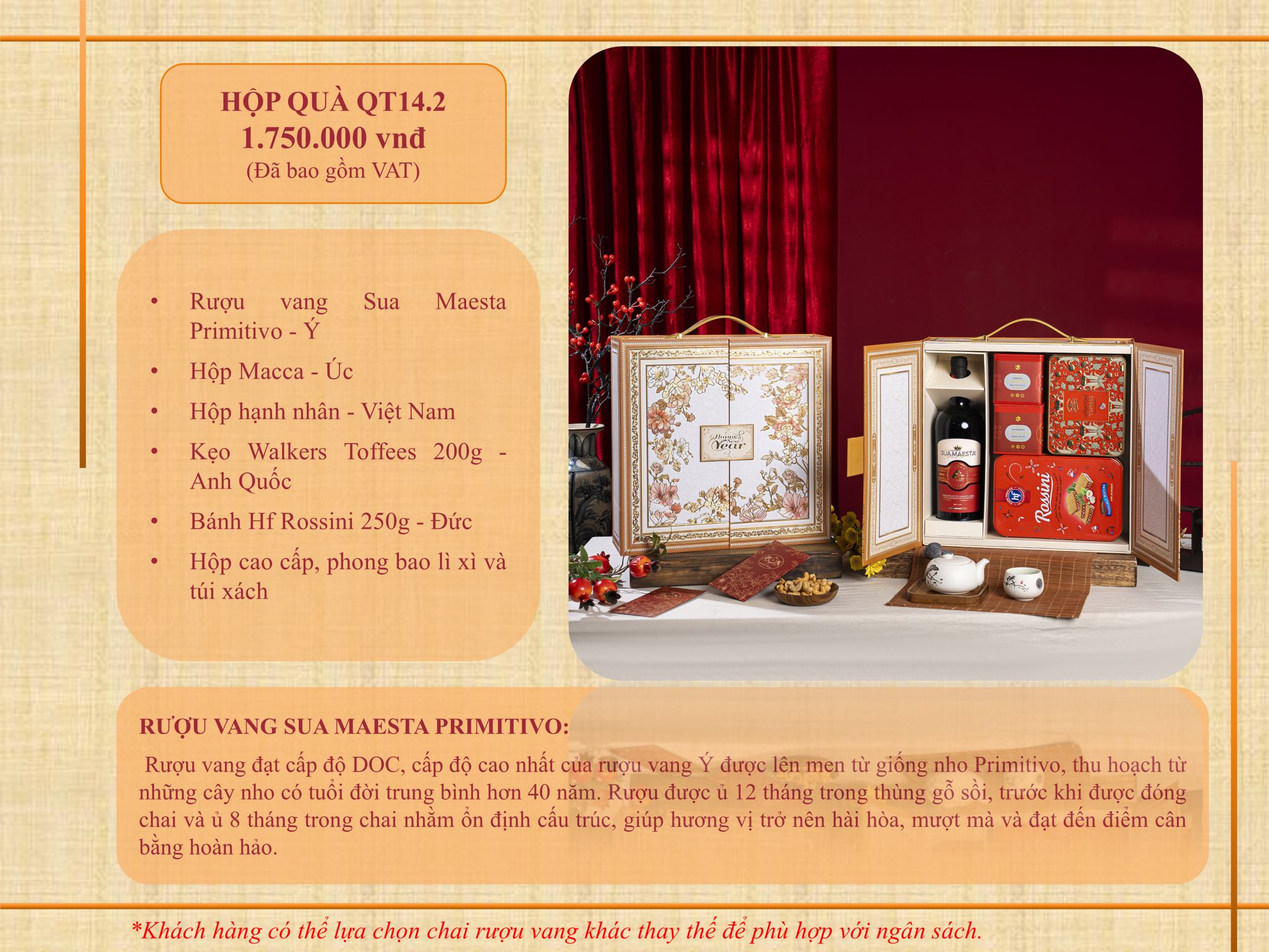 Hộp quà Tết QT14.2 là một trong những sản phẩm cao cấp trong bộ sưu tập quà Tết 2026, gồm các thành phần sau: