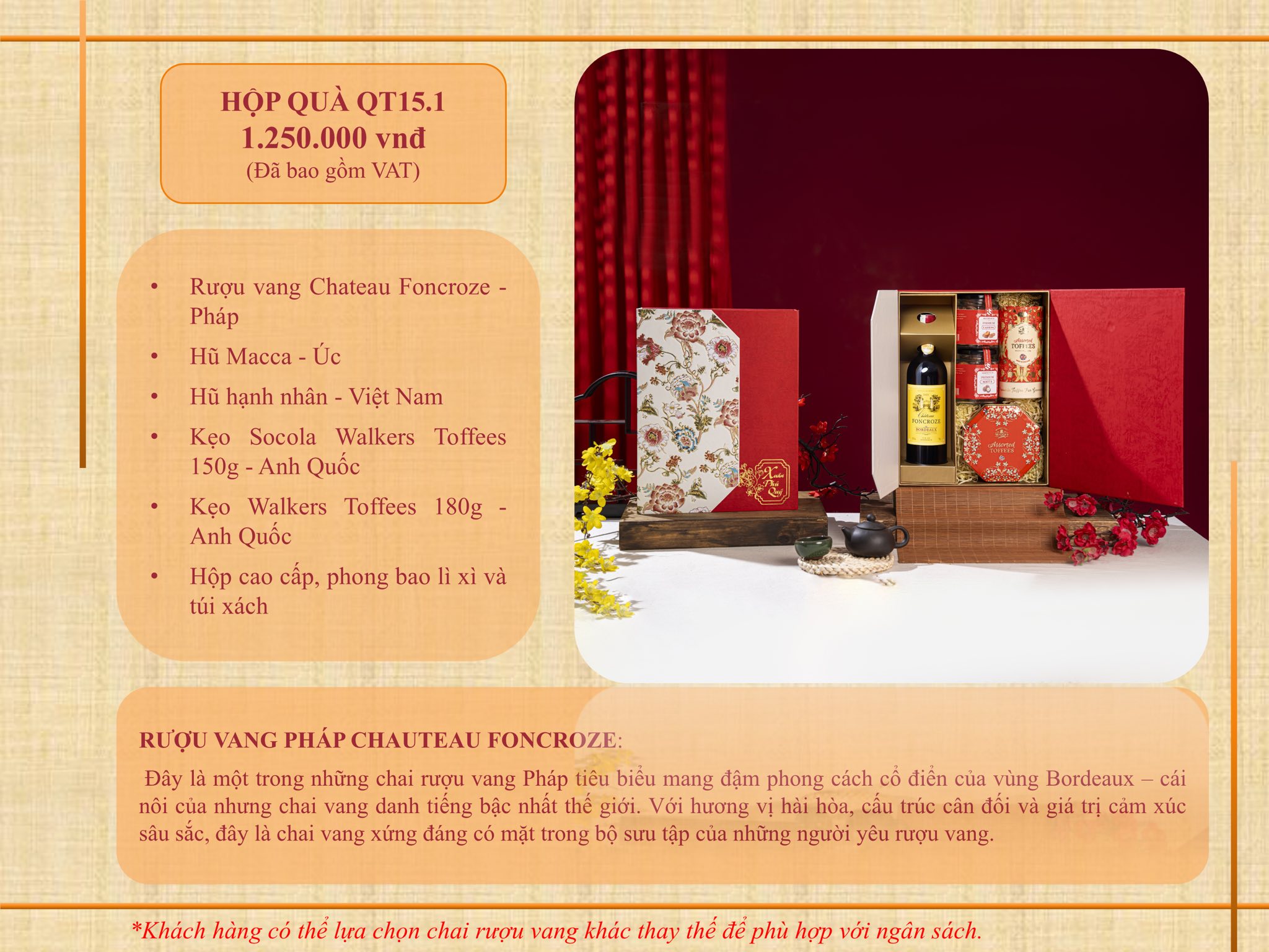 Tết Nguyên Đán luôn là dịp đặc biệt để chúng ta thể hiện tình cảm và sự biết ơn đối với những người xung quanh. Và một món quà Tết tinh tế, ý nghĩa sẽ là lựa chọn hoàn hảo trong mùa lễ hội. Hộp Quà Tặng 2026 QT15.1 chính là sự lựa chọn tuyệt vời của nhà Vang Chất, mang đến sự sang trọng và ý nghĩa cho những món quà Tết của bạn.