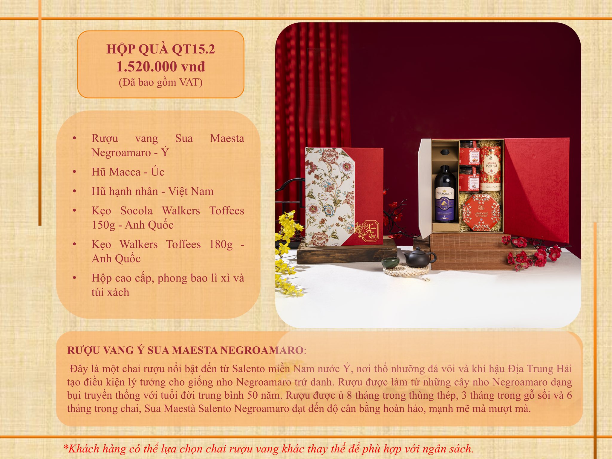 Tết Nguyên Đán luôn là dịp đặc biệt để chúng ta thể hiện tình cảm và sự biết ơn đối với những người xung quanh. Và một món quà Tết tinh tế, ý nghĩa sẽ là lựa chọn hoàn hảo trong mùa lễ hội. Hộp Quà Tặng 2026 QT15.2 chính là sự lựa chọn tuyệt vời của nhà Vang Chất, mang đến sự sang trọng và ý nghĩa cho những món quà Tết của bạn.