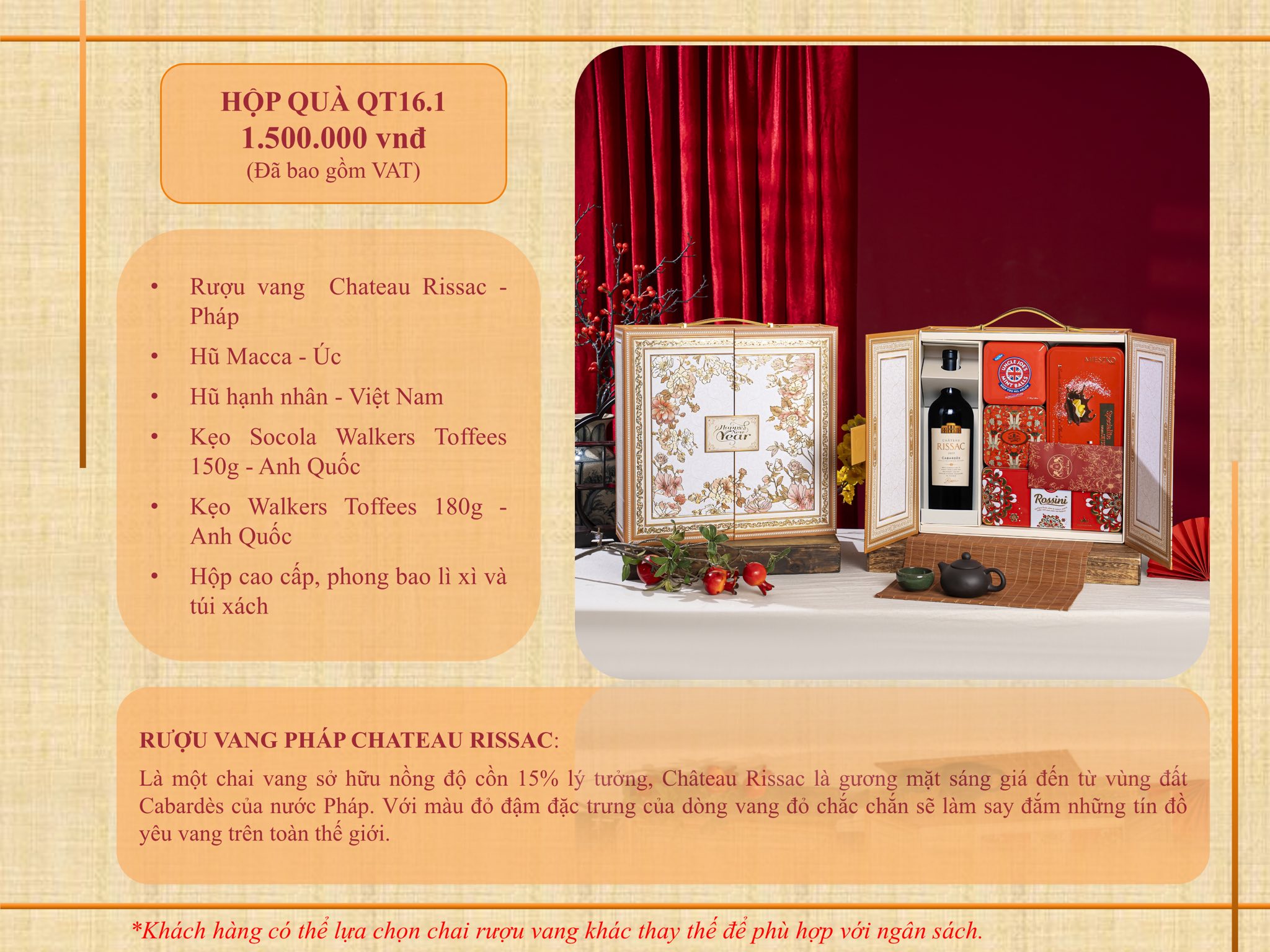Mỗi dịp Tết đến xuân về, việc chọn lựa những món quà Tết ý nghĩa và đẳng cấp luôn là điều mà nhiều người quan tâm, đặc biệt là trong mối quan hệ công việc, gia đình hay bạn bè. Hộp quà tặng QT16.1 là một trong những lựa chọn hoàn hảo, đáp ứng được cả về mặt tinh tế, sang trọng và giá trị sử dụng. Được thiết kế bởi thương hiệu Vang Chất, hộp quà này chắc chắn sẽ khiến người nhận cảm thấy ấm áp và đầy đủ hương vị tết.