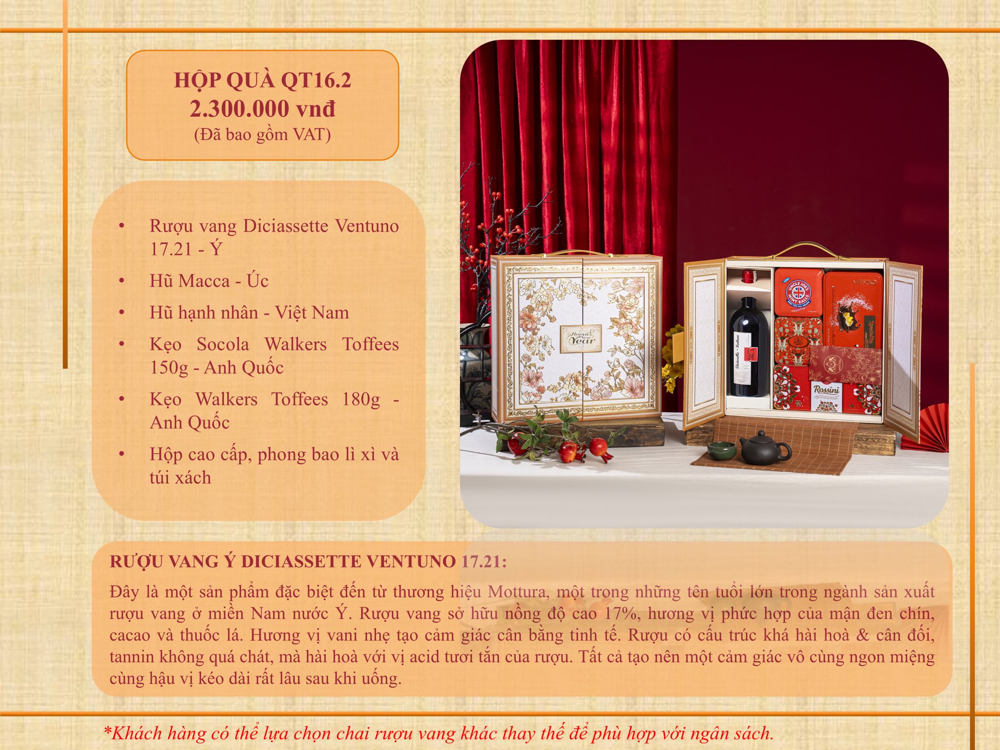 Mỗi dịp Tết đến xuân về, việc chọn lựa những món quà Tết ý nghĩa và đẳng cấp luôn là điều mà nhiều người quan tâm, đặc biệt là trong mối quan hệ công việc, gia đình hay bạn bè. Hộp quà tặng QT16.2 là một trong những lựa chọn hoàn hảo, đáp ứng được cả về mặt tinh tế, sang trọng và giá trị sử dụng. Được thiết kế bởi thương hiệu Vang Chất, hộp quà này chắc chắn sẽ khiến người nhận cảm thấy ấm áp và đầy đủ hương vị tết.