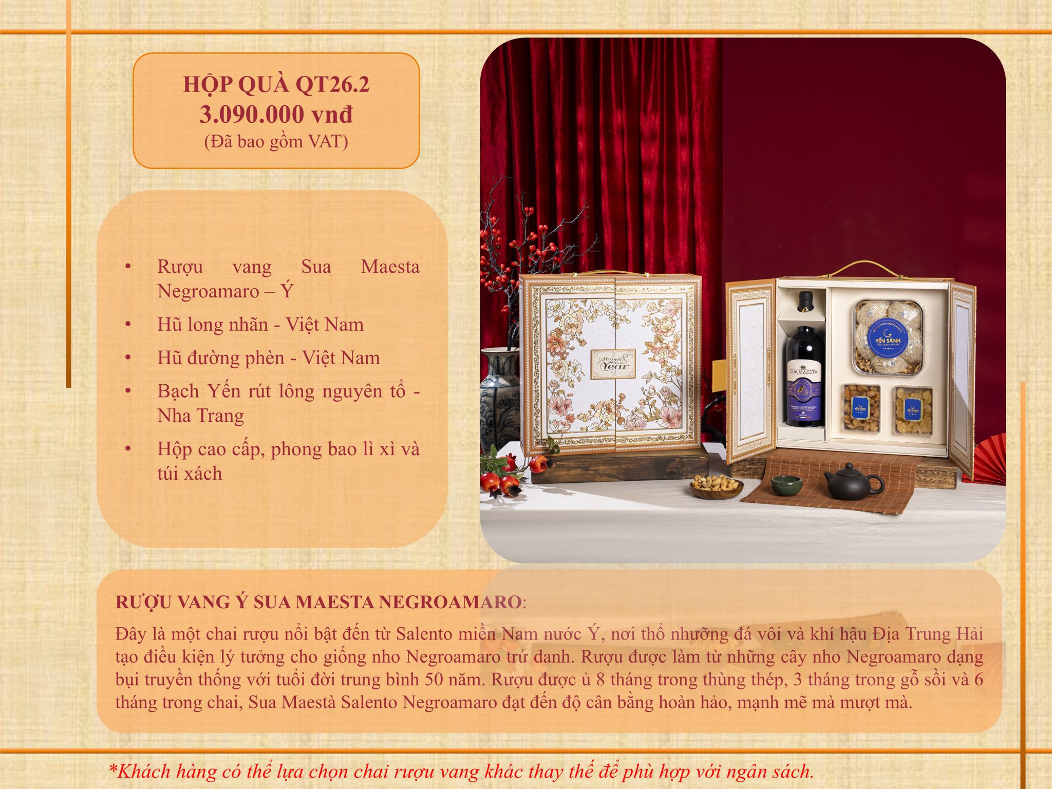Tết Nguyên Đán là thời điểm đặc biệt để mọi người gửi gắm những tình cảm chân thành, lời chúc tốt đẹp và sẻ chia những niềm vui, sự may mắn đến gia đình, bạn bè, đối tác và đồng nghiệp. Một món quà Tết vừa sang trọng, tinh tế lại mang đậm giá trị văn hóa sẽ giúp bạn thể hiện lòng thành kính và sự trân trọng. Hộp quà Tết rượu vang 2026 QT26.2 chính là lựa chọn hoàn hảo để gửi gắm những lời chúc phúc, thịnh vượng cho những người bạn yêu quý trong mùa xuân này.